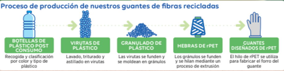 El resultado del ACV, gracias al uso de fibras recicladas en el tejido y la reducción del embalaje con un 30% de plástico reciclado en los guantes
